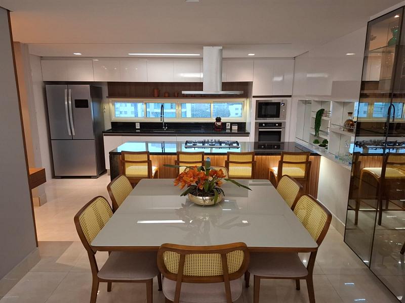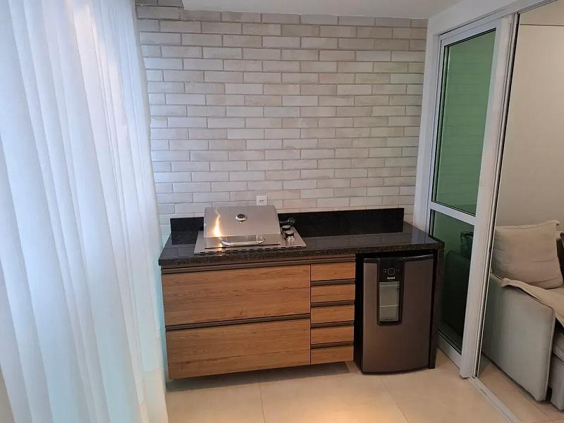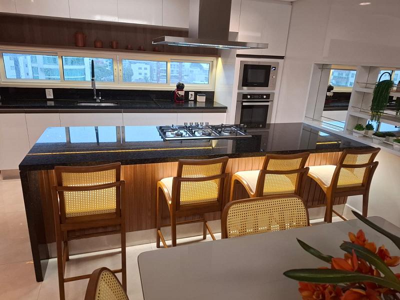 A cozinha é um ponto alto do imóvel: é uma cozinha em ilha, totalmente integrada à sala, equipada com coifa, fogão, forno e micro-ondas da renomada marca italiana Cris­sair. A varanda é grande e ainda possui uma churrasqueira a gás, perfeita pra receber a família e os amigos.