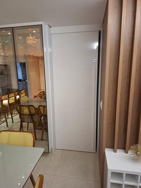 Com um amplo espaço de despensa, cheia de armários e totalmente separada, o apartamento ainda conta com ar condicionado na sala (58 mil BTU, Daikin) e também nos 3 quartos. Uma porta de correr isola a sala da área íntima, aumentando a privacidade.